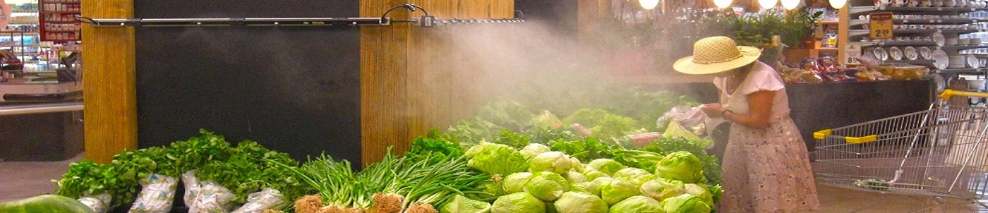 Il est très important pour un nombre de produits alimentaires d'assurer qualité et fraîcheur avec une humidité optimale. L'humidification de l'air ajoutée protège les pertes de poids pendant le stockage dans les secteurs. Quand les fruits et légumes arrivent sur les linéaires de supermarches, ils ont déjà voyager et pour que les substances telles que les vitamines soit préservées, des conditions adéquates doivent être maintenues pendant le transport et le stockage. Les légumes ne se conservent que deux jours à 20°c. à une température de 2°c avec 80% d'humidité relative, ils restent toutefois aussi frais et riches en vitamines que le jour de la cueillette. Les fruits et légumes sèchent rapidement une bonne humidité garantie une fraîcheur et évite une perte qualité. Un système d'humidification approprié dans les stocks et dans la zone d'exposition garantit que les fruits et légumes resteront frais et vendables, sans perte de poids.